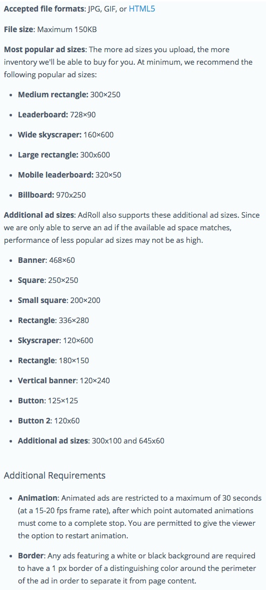 Note: there are size requirements, these are shown below. There are restrictions and limitations to what content you can have and your ads will need to be checked before your campaign can go live.